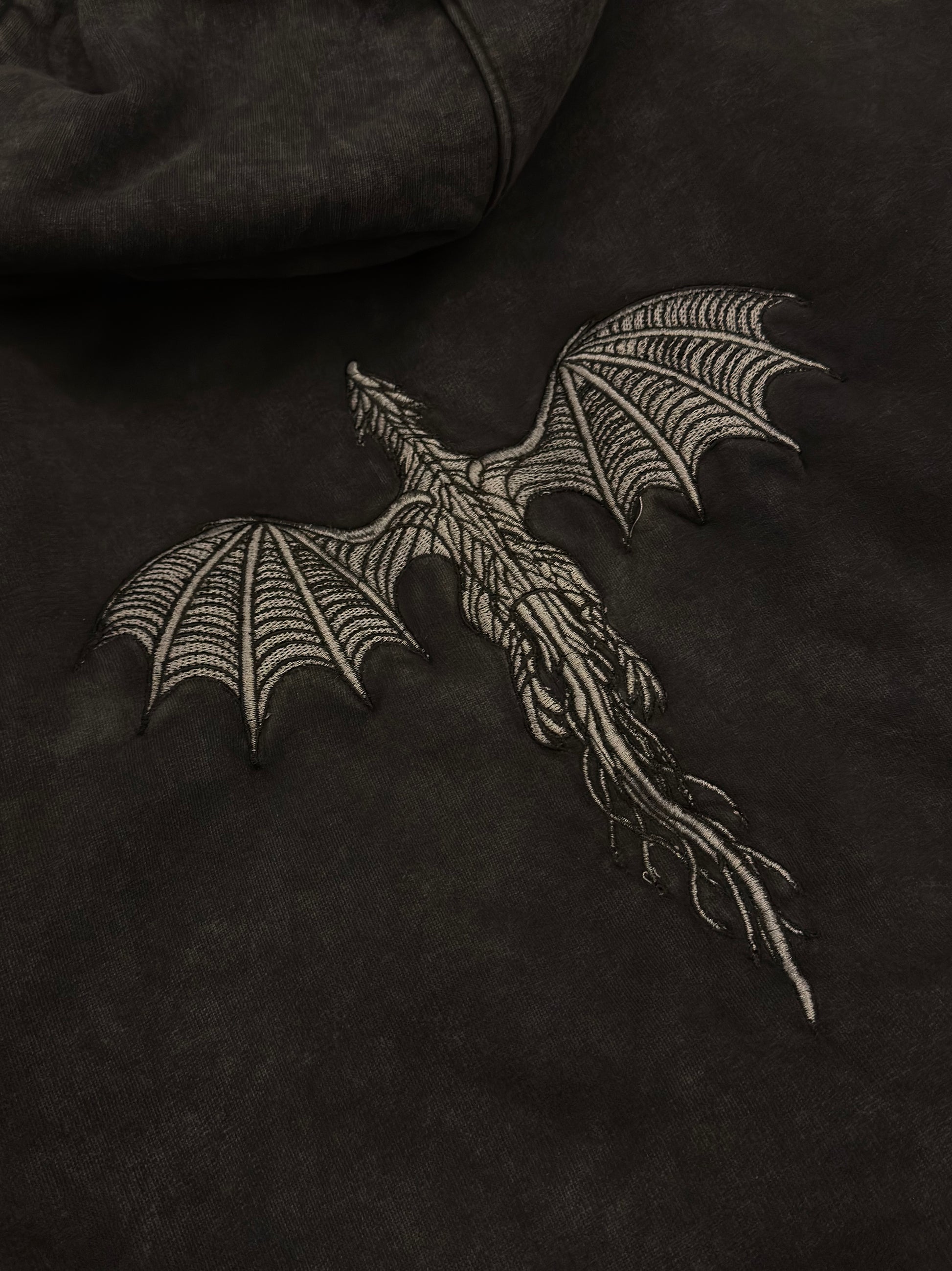 Crafted in a premium washed dark grey finish, this hoodie features a tonal embroidered dragon on the back—subtle, textured, and powerful without being loud. The boxy athletic fit gives you room to move while maintaining a clean, structured silhouette.